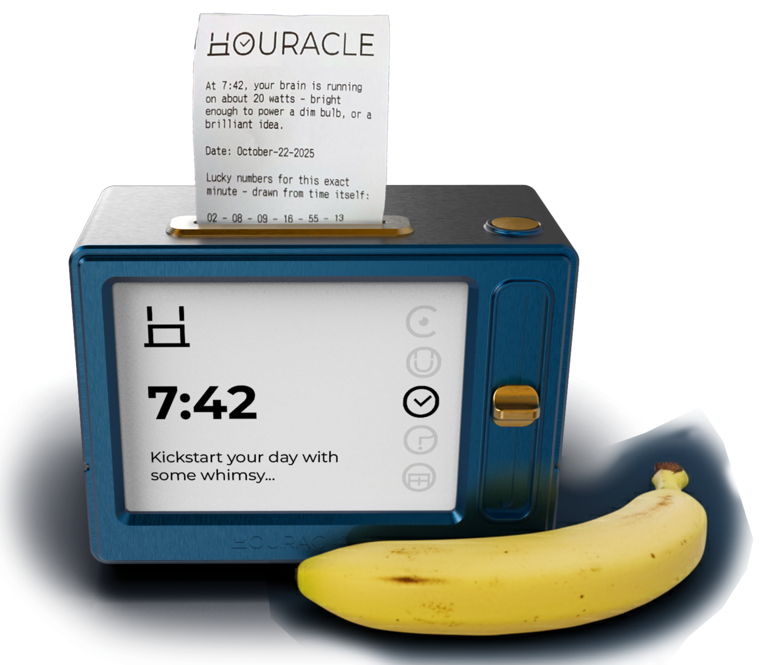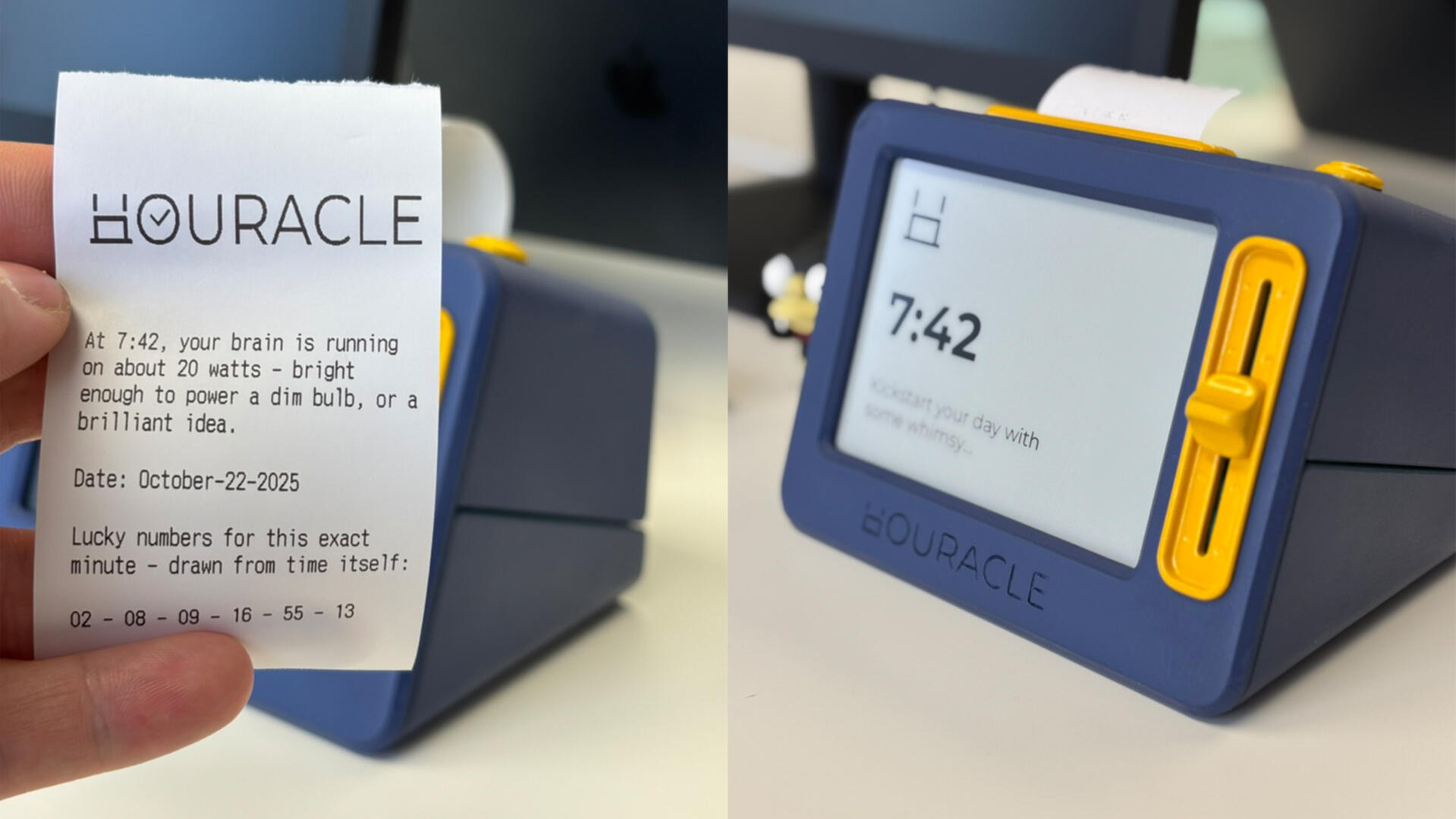 Houracle is an e-ink clock and a printer that captures the sense of anticipation once found when opening fortune cookies and baseball cards.